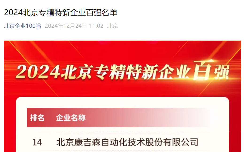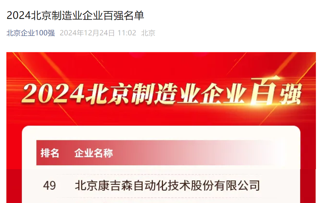 2024年12月24日,“2024京津冀產業(yè)鏈供應鏈協(xié)同發(fā)展大會暨北京百強企業(yè)論壇”發(fā)布了2024北京企業(yè)百強榜單,北京康吉森自動化技術股份有限公司(以下簡稱“康吉森股份”)榮登“2024北京制造業(yè)企業(yè)百強”“2024北京專精特新企業(yè)百強”榜單。