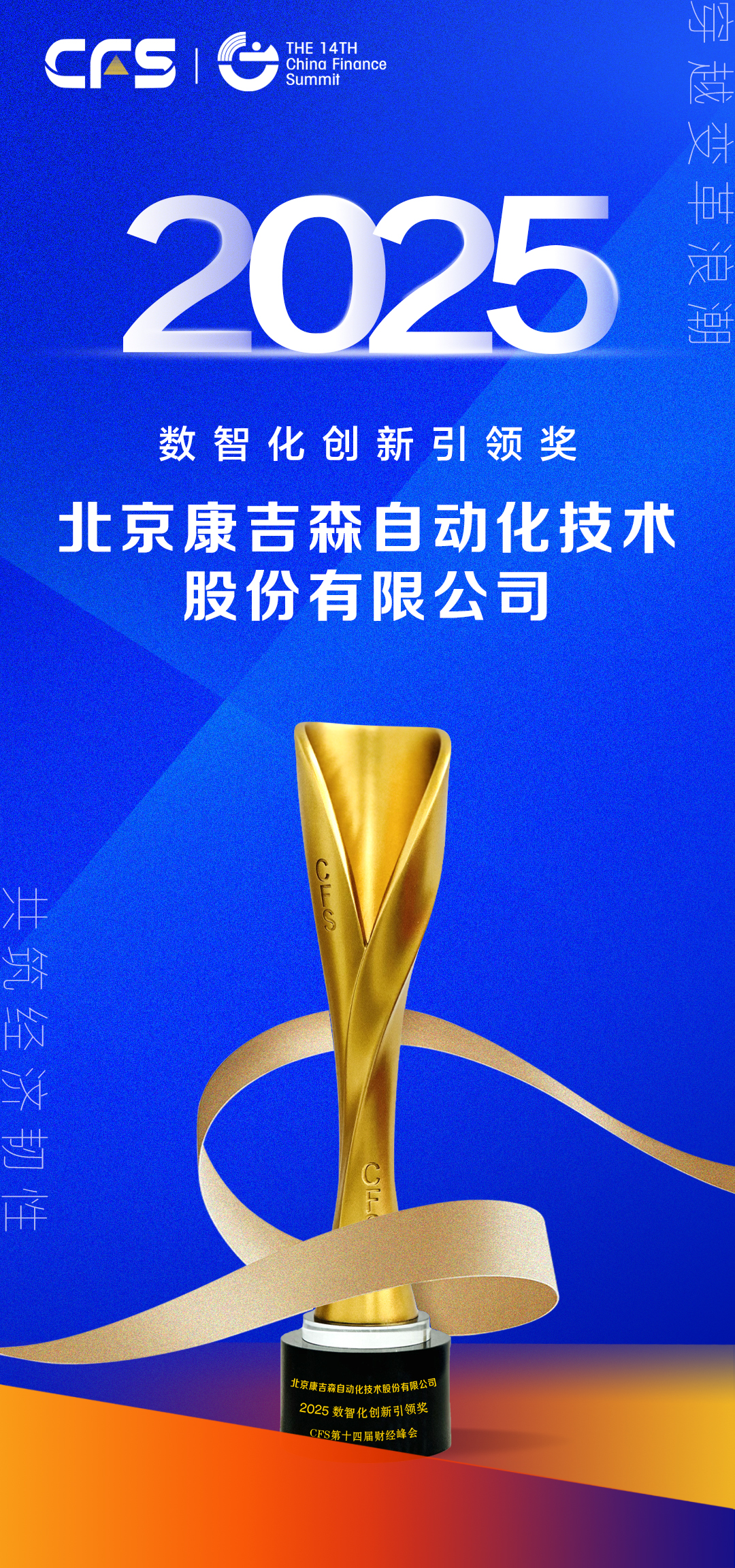 2025年7月16日第十四屆財(cái)經(jīng)峰會(huì)在上海召開,北京康吉森自動(dòng)化技術(shù)股份有限公司憑借其在工業(yè)自動(dòng)化與數(shù)字化領(lǐng)域的卓越創(chuàng)新能力和突出貢獻(xiàn),成功斬獲“2025數(shù)智化創(chuàng)新引領(lǐng)獎(jiǎng)”。同時(shí),公司總裁周政強(qiáng)先生榮膺“2025(行業(yè))影響力人物”稱號(hào)。此次雙獎(jiǎng)加冕,是業(yè)界對(duì)康吉森股份技術(shù)實(shí)力、行業(yè)領(lǐng)導(dǎo)力及周政強(qiáng)總裁杰出貢獻(xiàn)的高度認(rèn)可。