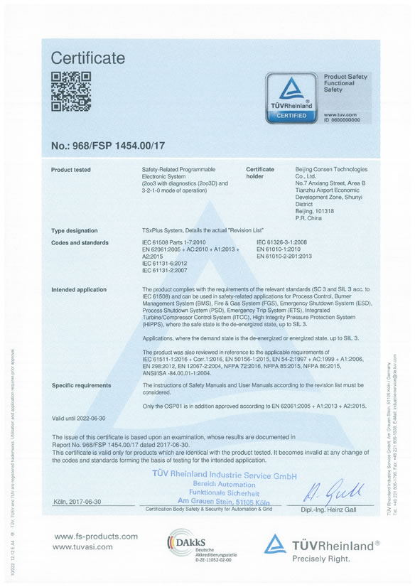 自主研發(fā)安全和關(guān)鍵控制系統(tǒng)TSxPlus,獲得德國萊茵TUV頒發(fā)的國內(nèi)首張FS&Cyber Security證書(功能安全和信息安全證書)和ISA Secure EDSA證書(美國信息安全證書)。